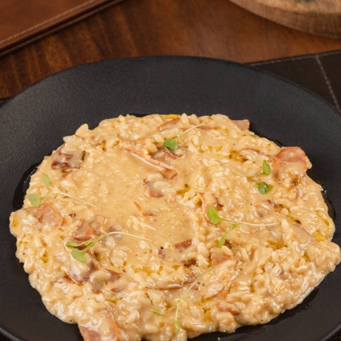 Deguste um irresistível Risoto de Bacon e Formaggio, representante majestoso da categoria 'Risotos'. Este prato combina a suavidade e cremosidade do arroz arbóreo italiano, cozido à perfeição, com a intensidade saborosa e crocante do bacon. A coroação vem com uma generosa porção de formaggio, cujo sabor autêntico e textura macia completam essa delícia. Cada garfada promete uma experiência sensorial inigualável, repleta de sabor e requinte. Ideal para apreciadores de uma boa culinária italiana.