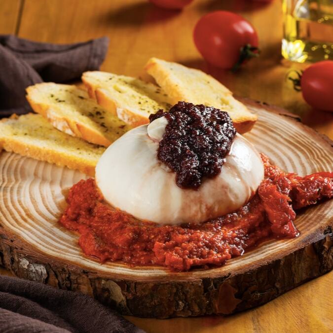 Deliciosa burrata de queijo, generosamente harmonizada com um autêntico pesto de tomate seco, realçando a riqueza de sabores. Acrescenta-se ainda azeitonas pretas cuidadosamente caramelizadas, trazendo um contraste adocicado ao paladar. Acompanha tomate seco, conferindo uma textura inigualável e torradas de pão italiano crocantes, que adicionam um requinte extra ao prato. Essa combinação é perfeita para os amantes de queijos e sabores mediterrâneos intensos.