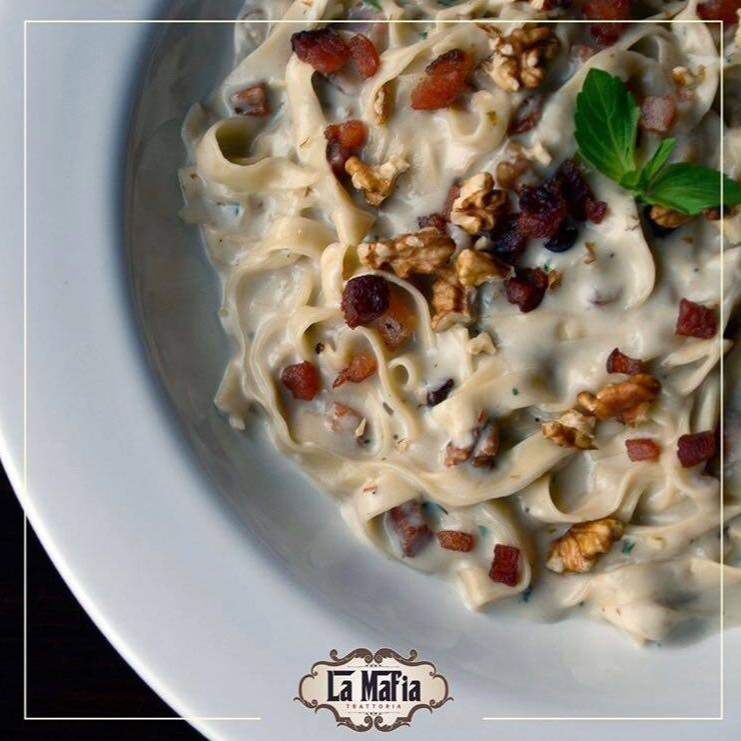 Delicie-se com nosso prato 'Bacon e Formaggio', uma estrela da nossa categoria 'Molhos com Carne'. Este prato exala a essência da autêntica culinária italiana, preparado com nata fresca de alta qualidade, envolvida com generosas lascas de bacon crocante. A adição de parmesão finamente ralado e a cremosa fonduta trazem uma combinação perfeita de sabores que derretem na boca. Para finalizar, uma pitada de salsinha fresca e manteiga dão o toque final, criando uma experiência gastronômica inesquecível.
