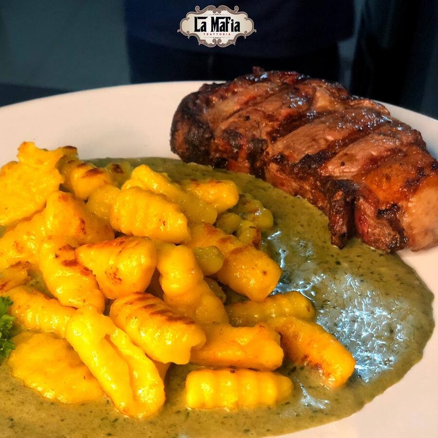 Este saboroso Entrecot é perfeitamente harmonizado com Nhoque frito. O prato é generosamente regado com um exquisito molho cremoso, que é habilmente preparado a partir de um autêntico pesto de manjericão fresco e um toque de limão. Esta combinação cria uma experiência gastronômica única, onde cada ingrediente é realçado e complementado pelos outros. Uma verdadeira explosão de sabores que irá agradar os paladares mais exigentes. Ideal para quem aprecia a sofisticação da culinária harmonizada.