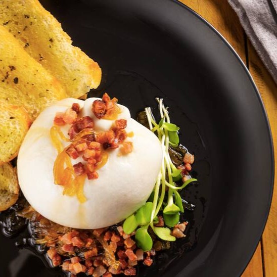 Deliciosa Burrata, feita do mais puro e cremoso queijo, servida com um irresistível molho de cebola caramelizada, que proporciona um equilíbrio perfeito de doçura. O prato é enriquecido com o sabor marcante do crispy de bacon. Para completar a experiência gastronômica, acompanha torradas de pão italiano, crocantes e perfeitamente douradas. É o prato ideal para aqueles que buscam uma combinação de sabores notável e sofisticada.