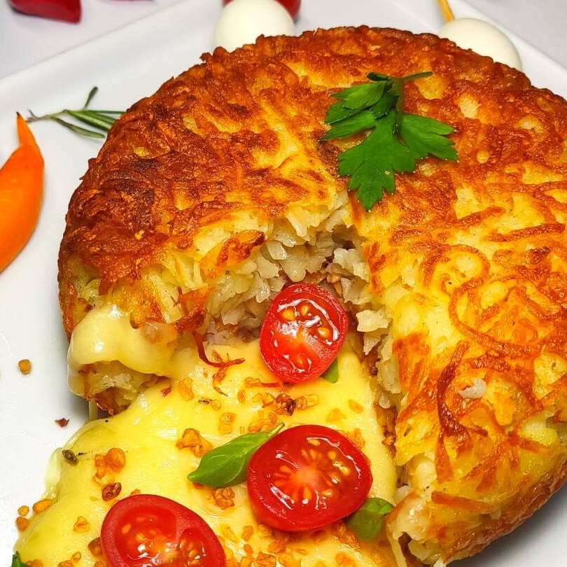 Batata Suíça de Pizza - Uma peça especial da nossa categoria 'Itens Especiais'. Trata-se de uma irresistível Batata Suíça Tradicional, elaborada com a suculenta massa de Batata Asterix. Seu recheio é um verdadeiro destaque, pois traz o sabor nostálgico e inconfundível de uma pizza autêntica: presunto requintado, mussarela derretida e um toque de orégano para acentuar ainda mais o sabor. Com 450g de puro prazer, este prato promete uma experiência gastronômica única, digna de repetir várias vezes. Experimente e apaixone-se!