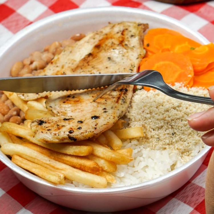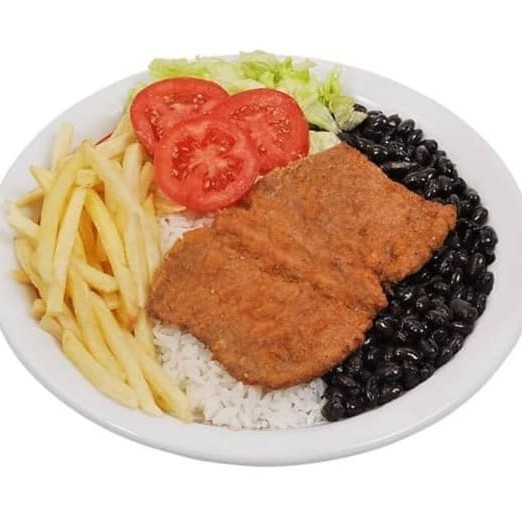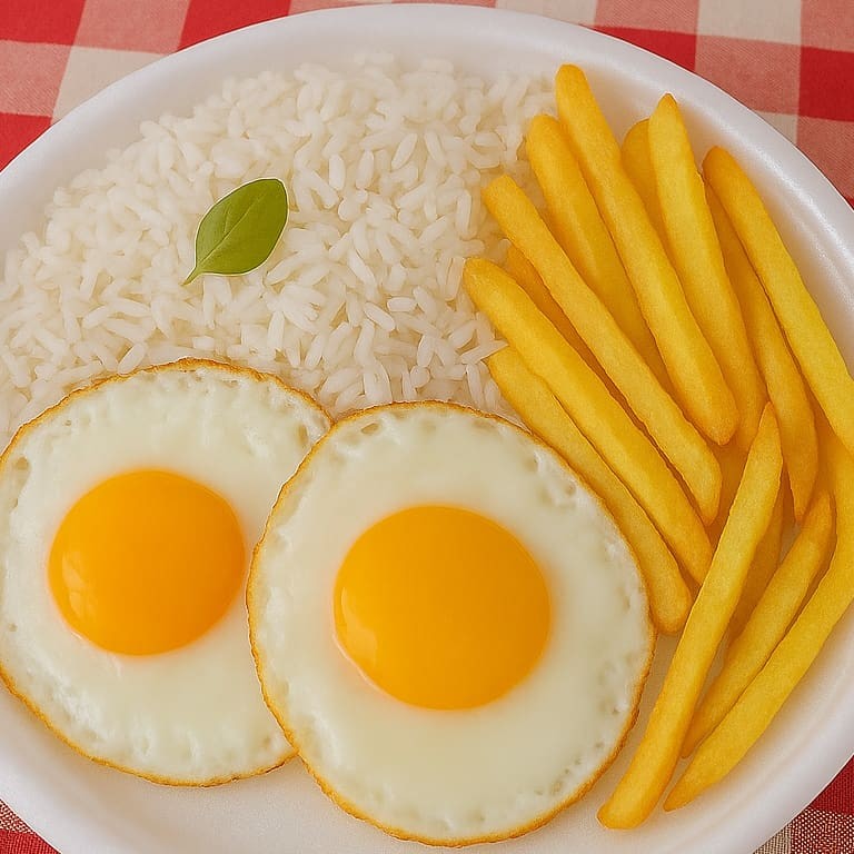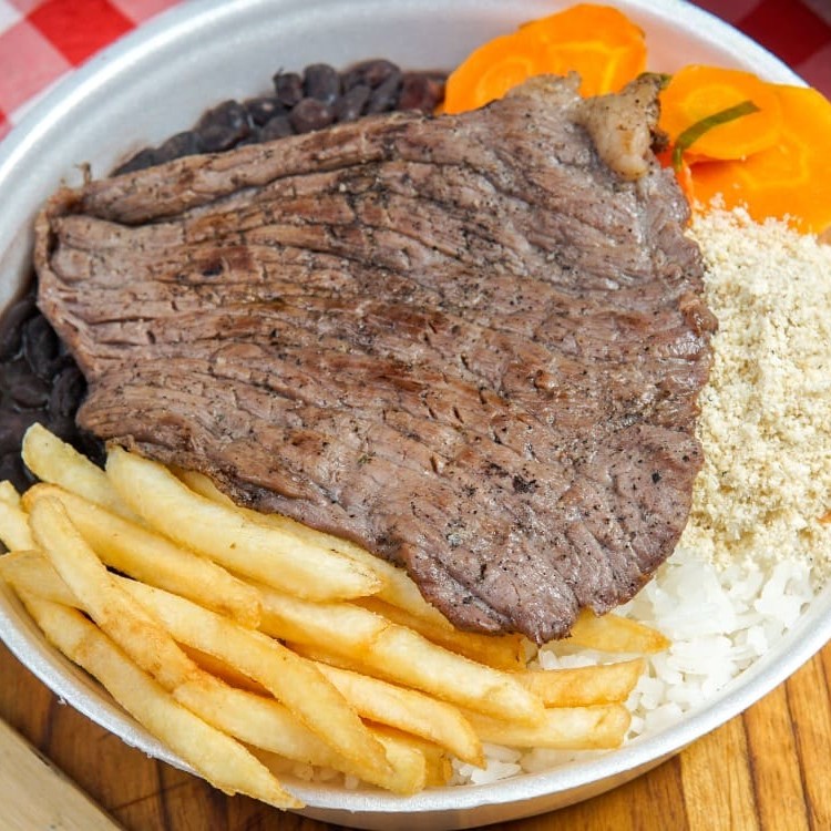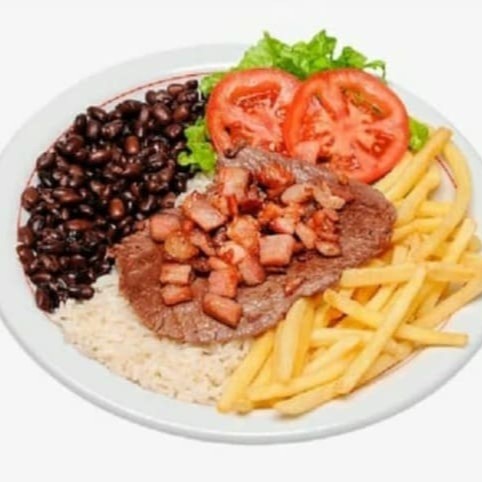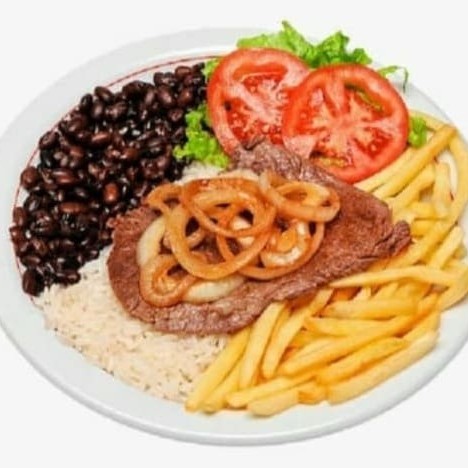 Preparada com dois ovos fritos no ponto certo, acompanha arroz soltinho, feijão caseiro saboroso e um refogado do Dia (como couve, repolho ou outra opção especial). Para complementar, você escolhe entre batatas fritas crocantes, purê cremoso ou batata palha dourada.