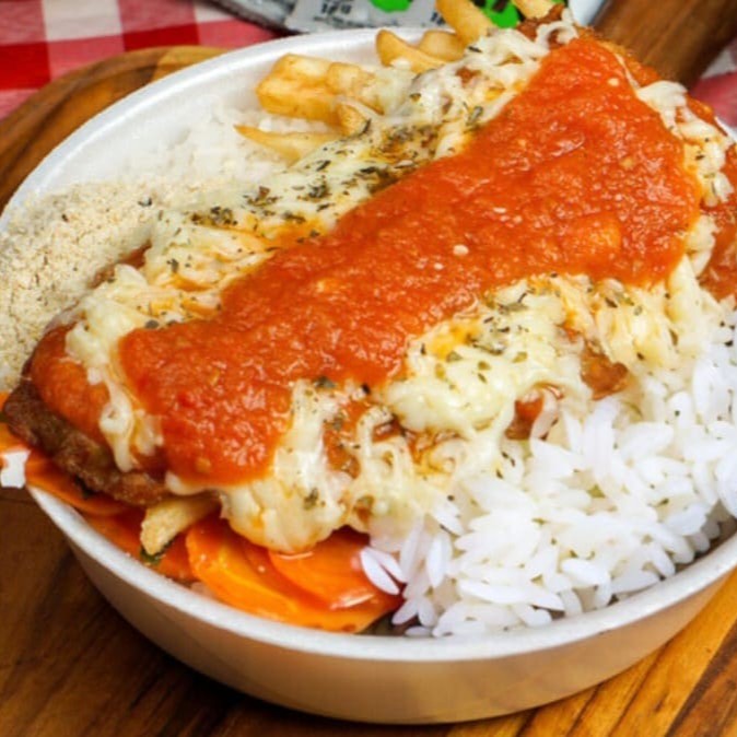 Suculento bife empanado, coberto com molho de tomate caseiro e uma generosa camada de queijo gratinado, acompanhado de espaguete al dente mergulhado no mesmo molho especial. Uma explosão de sabor que une tradição e conforto em um prato completo!