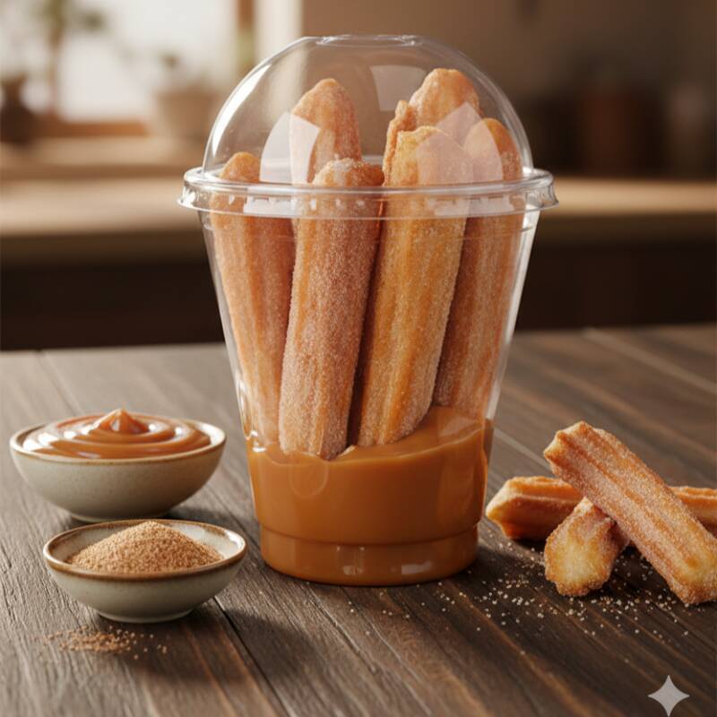 4 clássicos churros espanhóis crocantes para serem mergulhados em nossos deliciosos doces. Agora acompanha um pote de doce com redução de preço.