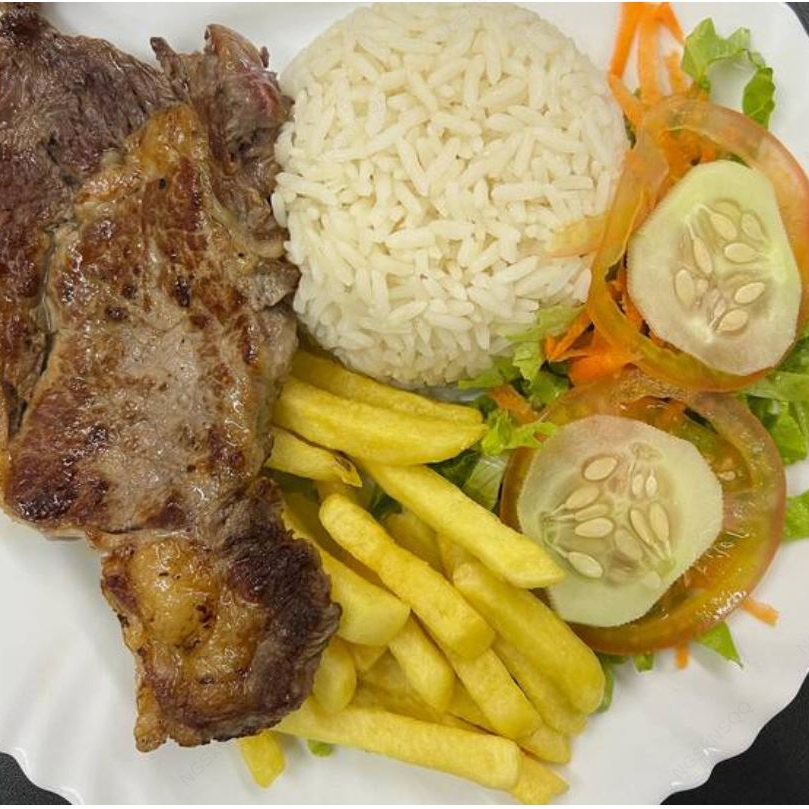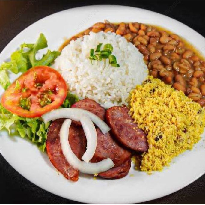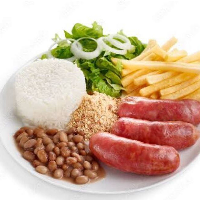 linguiça na chapa com uma boa porçao de arroz feijao farofa e batata