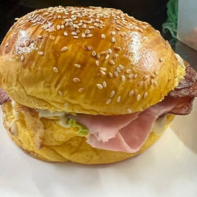 pão de brioche com direito a tudo queijo,presunto,calabresa,ovo,bacon,frango e salada pra finalizar