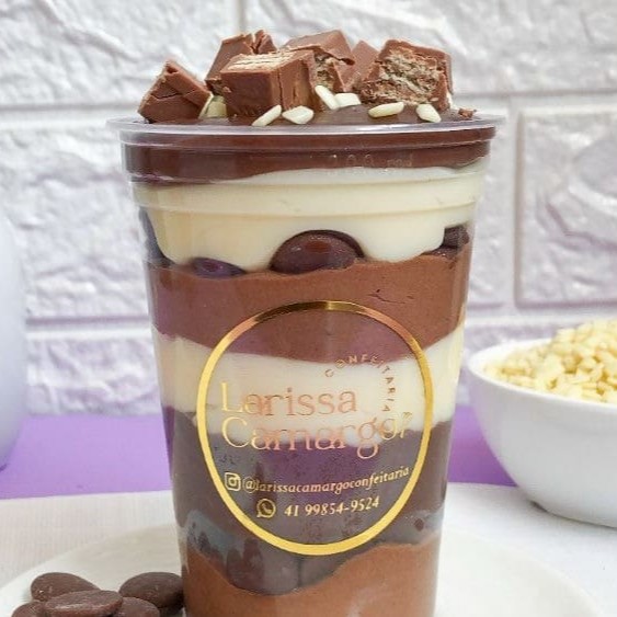 O 'Copo Dueto', da categoria 'Copos da Felicidade', é uma verdadeira indulgência para os amantes de chocolate. Feito com uma mousse de chocolate meio amargo sedosa e luxuosa, é combinado com nosso brigadeiro de chocolate caseiro, rico e cremoso, que derrete na boca. Adicionamos um toque especial com brigadeiro Ninho, proporcionando um sabor suave e único. Para finalizar, incrementamos com pedaços de chocolate crocante que adicionam uma textura irresistível. É o equilíbrio perfeito entre doçura e intensidade, uma verdadeira sinfonia de sabores em um copo.