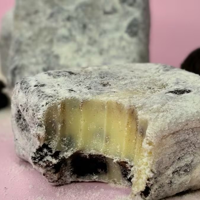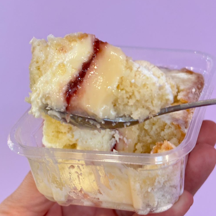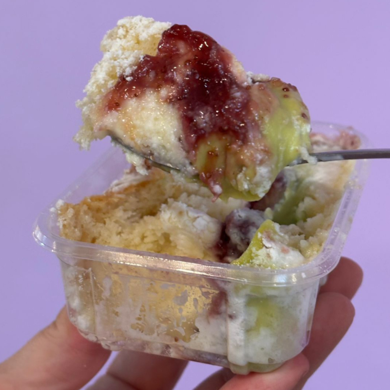 Massa branca molhadinha, recheado com gelado Ninho, brigadeiro de pistache e geleia artesanal de morango, envolto em leite Ninho.