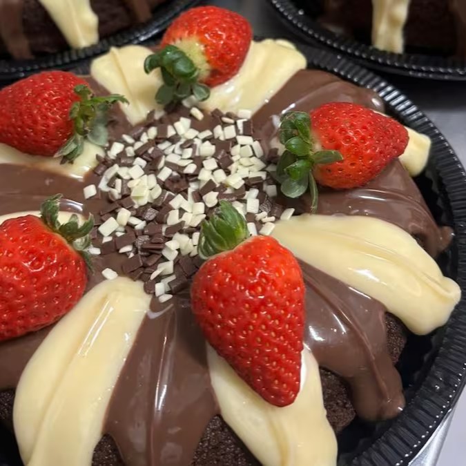 O 'Vucão Dois Amores' é uma deliciosa opção para o seu café da tarde. Apresenta uma massa de chocolate irresistivelmente úmida e macia, generosamente recheada com dois tipos de brigadeiro: o clássico de chocolate e o inovador brigadeiro Ninho. Para finalizar, este prato divino é primorosamente confeitado com morangos frescos, aportando um toque de frescor, e granulado duo, proporcionando uma agradável crocância. É um prato que seduz pelo sabor, encanta pela apresentação e surpreende pela harmoniosa combinação de texturas.