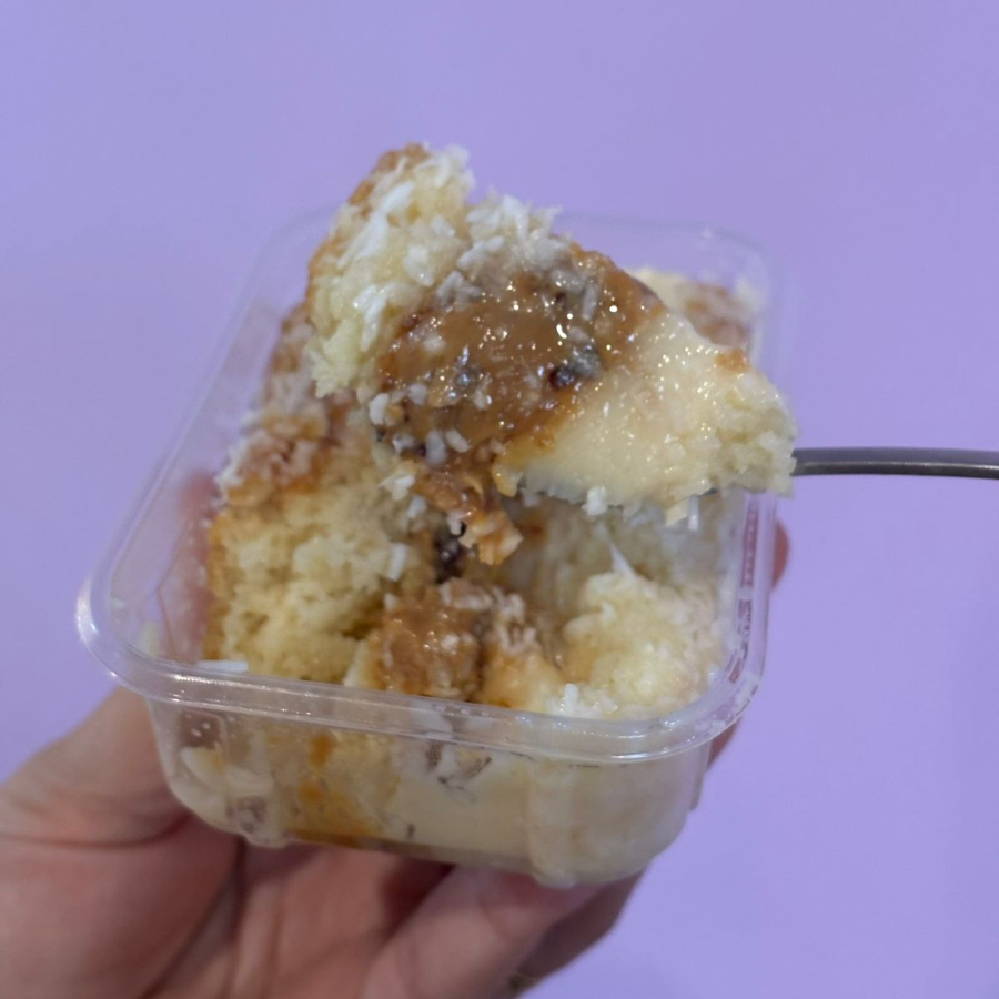 Massa branca molhadinha, recheio de brigadeiro de coco, leite condensado cozido e compota de ameixa, envolto em coco.