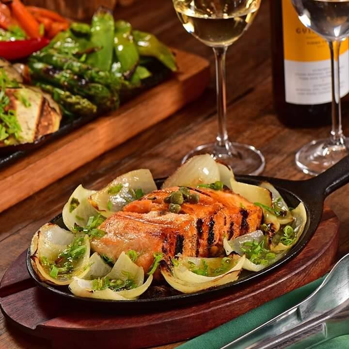 Apresentamos o 'Salmón Parrillero', uma requintada seleção da categoria 'Pescados y Mariscos'. Este prato traz o salmão, conhecido por sua textura macia e sabor sutil, cuidadosamente preparado na brasa para realçar sua riqueza de sabores. Complementado com cebolas caramelizadas, que adicionam uma doçura suave e um toque crocante.
