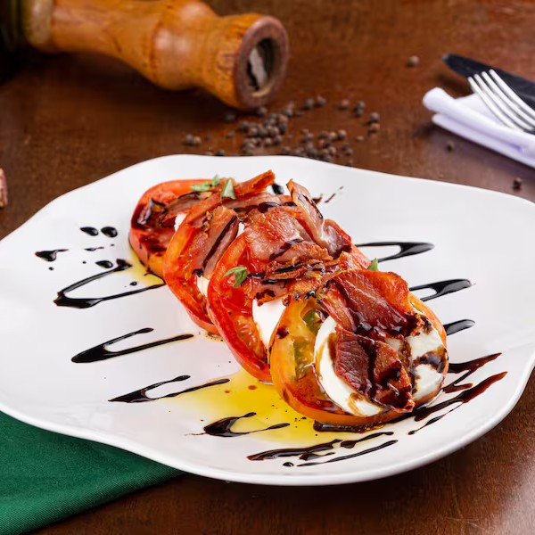 Tomate, mussarela de búfala la bufalina, presunto parma, manjericão e redução de balsâmico.