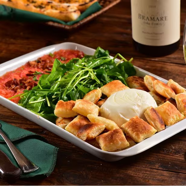 Deliciosa Burrata, um queijo cremoso de búfala de textura suave e sabor inigualável, servida como a estrela do prato. Acompanha tomates frescos, conferindo uma explosão de sabor e cor, e torradas crocantes, que agregam uma textura irresistível ao prato. Uma entrada perfeita, que harmoniza sabores e texturas, originária das melhores tradições culinárias. Ideal para abrir o apetite e preparar o paladar para os pratos principais.