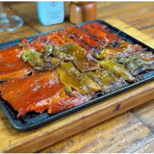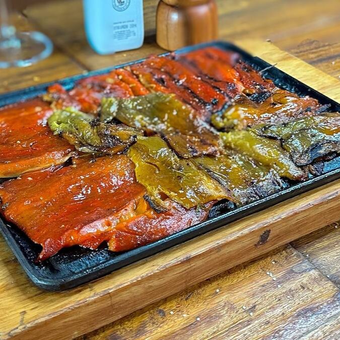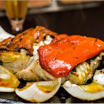 Bacalhau cuidadosamente grelhado até atingir a perfeição, garantindo uma textura incrivelmente suculenta e saborosa. Para intensificar ainda mais a experiência, o prato é harmoniosamente acompanhado por pimentões e cebolas, ambos igualmente preparados na brasa. A combinação desses ingredientes, cuidadosamente escolhidos, resulta em um prato de sabor inigualável e notas defumadas.