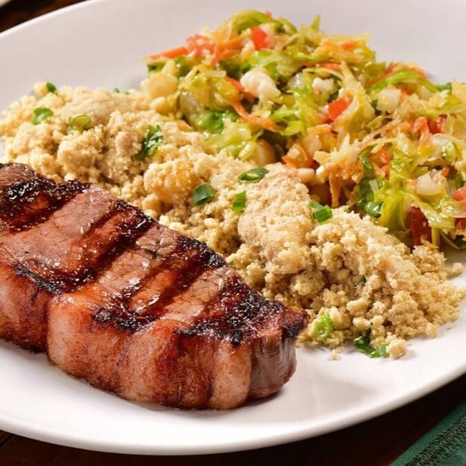 Bife de Chorizo feito na Parrilla (aprox. 200g). Acompanha Farofa de Ovos e Salada Giovanna (Alface Americana, tomate, cebola, palmito, cenoura, mostarda, maionese, batata palha e queijo parmesão)