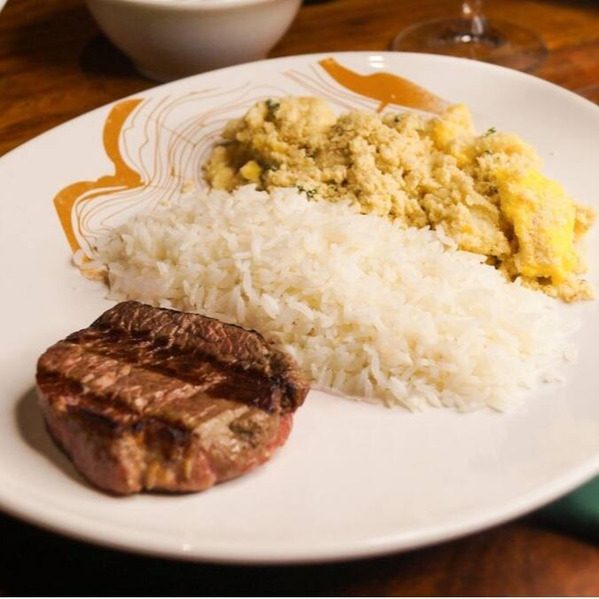 File Mignon (Aproximadamente 200g), Chorizo Parrillero (Aproximadamente 100g in natura) Acompanha Arroz, Farofa de huevos e maionese de Batatas.