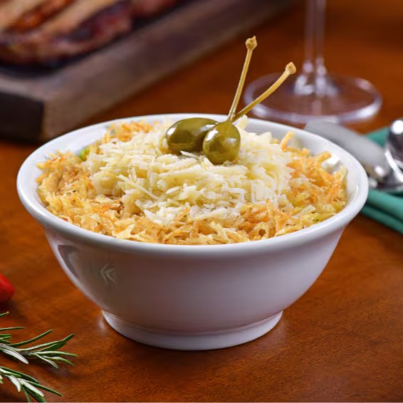 Acompanha Arroz Branco, farofa e maionese de batatas.