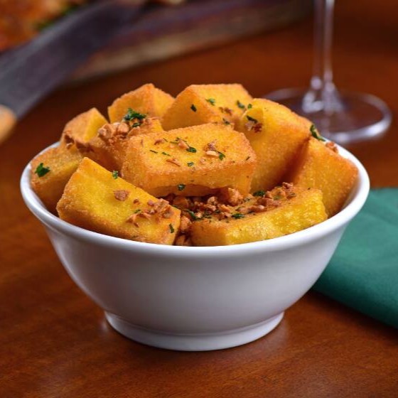 Polenta frita com alho e salsinha.