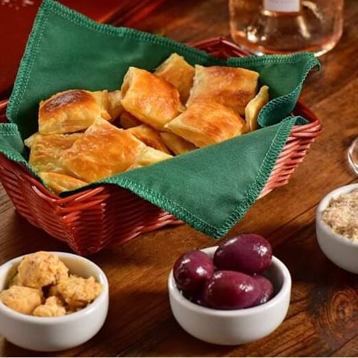 Pães de massa folhada, patê de presunto Parma, manteiga de amêndoas e azeitonas Azapa