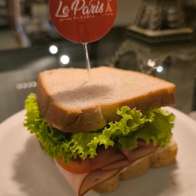 Pão integral com requeijão, alface, tomate, queijo mussarela e peito de peru.