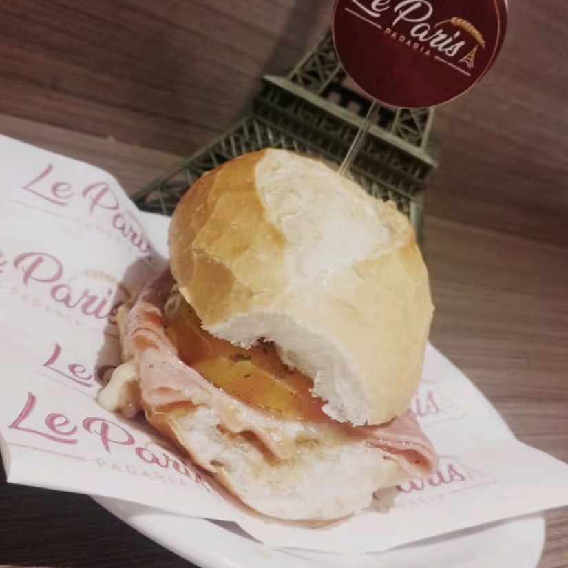 Pão com maionese, hamburguer, alface, tomate, queijo mussarela, presunto e bacon.