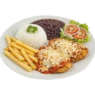 Bife parmegiana, arroz, feijão, salada, batata frita.