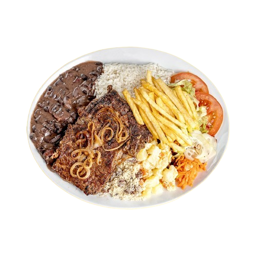 Arroz, Feijão, Ovo Frito, Bife Grelhado, Farofa, Batata Frita e Salada.