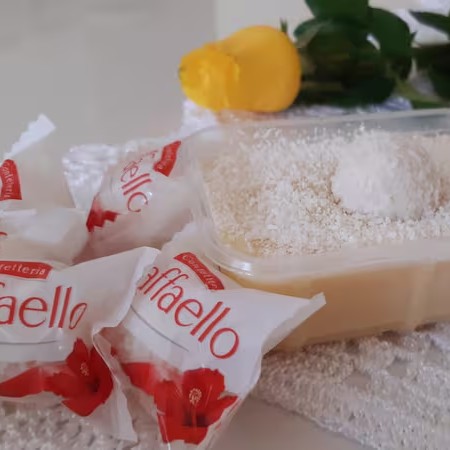 Um delicioso recheio de Rafaello com chocolate branco e coco Essa delícia de Rafaello pesa em média 220g.