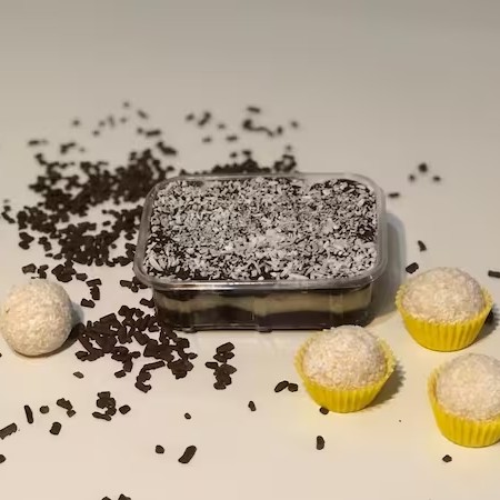 Uma camada de brigadeiro uma camada de beijinho e mais uma camada de brigadeiro Cada um pesa em média 220g. Serve 1 pessoa (220g)