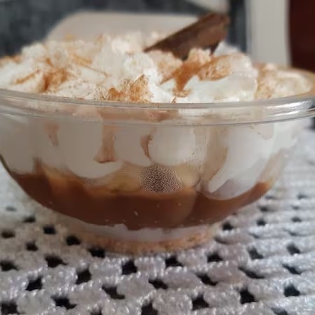 Ingredientes: Farofa de cukis, Doce de leite de leite condensado moça cozido, Bananas, nata e Polvilhada com canela. Peso 200g