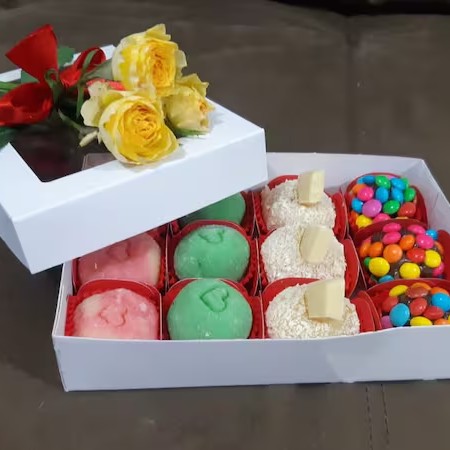 A Caixa Kit elegância vem com 12 deliciosos docinhos a sua escolha! Huuuuum... O kit vai com: 3 Surpresas de Uva 3 Casadinho com Brigadeiro de Morango 3 Brigadeiros de Laka 3 Brigadeiros com Confete E ainda pode escolher trocar ainda por: Leite Ninho com Nutella Brigadeiros com Chocolate Belga