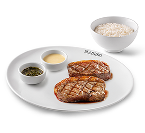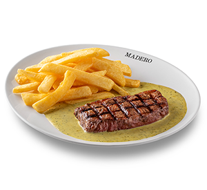 330 g* - Contrafilé grelhado na churrasqueira em fogo forte, Madero ranch sauce e chimichurri. Servido com um acompanhamento à sua escolha. *Peso in natura antes da cocção.