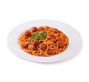 Bolinhos de carne (120 g*) assados e cozidos em molho feito com tomates orgânicos (230 g). Escolha a sua massa (spaghetti, penne ou ravioli de ricota e espinafre). *Peso in natura antes da cocção.