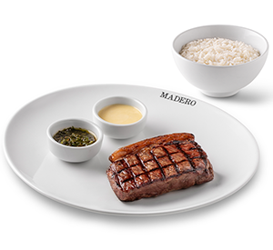 250 g* - Contrafilé grelhado na churrasqueira em fogo forte, Madero ranch sauce e chimichurri. Servido com um acompanhamento à sua escolha. *Peso in natura antes da cocção.