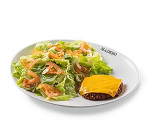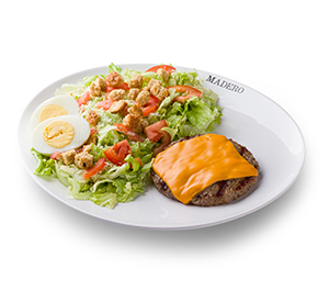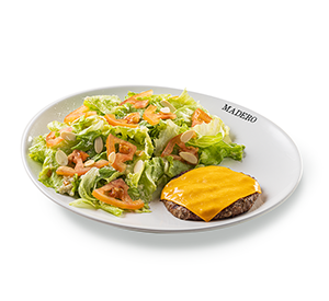 270 g - Alface e tomate orgânicos, ovo cozido, molho caesar, queijo parmesão, panzanellas e 1 hamburger Madero (130g*) com queijo tipo cheddar. - Molho caesar separado. *Peso in natura antes da cocção