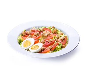 160 g - Alface e tomate orgânicos, ovo cozido, queijo parmesão e panzanellas - Molho caesar separado.