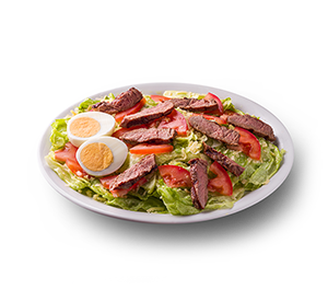 270 g - Alface e tomate orgânicos, ovo cozido, molho caesar, queijo parmesão, panzanellas e tiras de filé mignon (100g*). - Molho caesar separado. *Peso in natura antes da cocção.