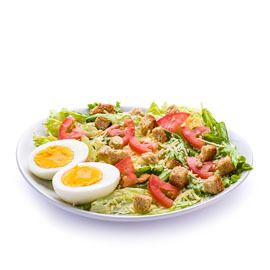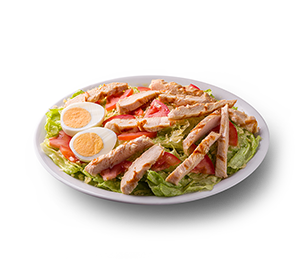 270 g - Alface e tomate orgânicos, ovo cozido, molho caesar, queijo parmesão, panzanellas e peito de frango grelhado (110 g*). - Molho caesar separado. *Peso in natura antes da cocção.