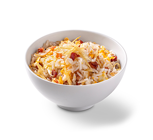 250 g - Arroz branco com ovo mexido, bacon em cubos e batata palha.