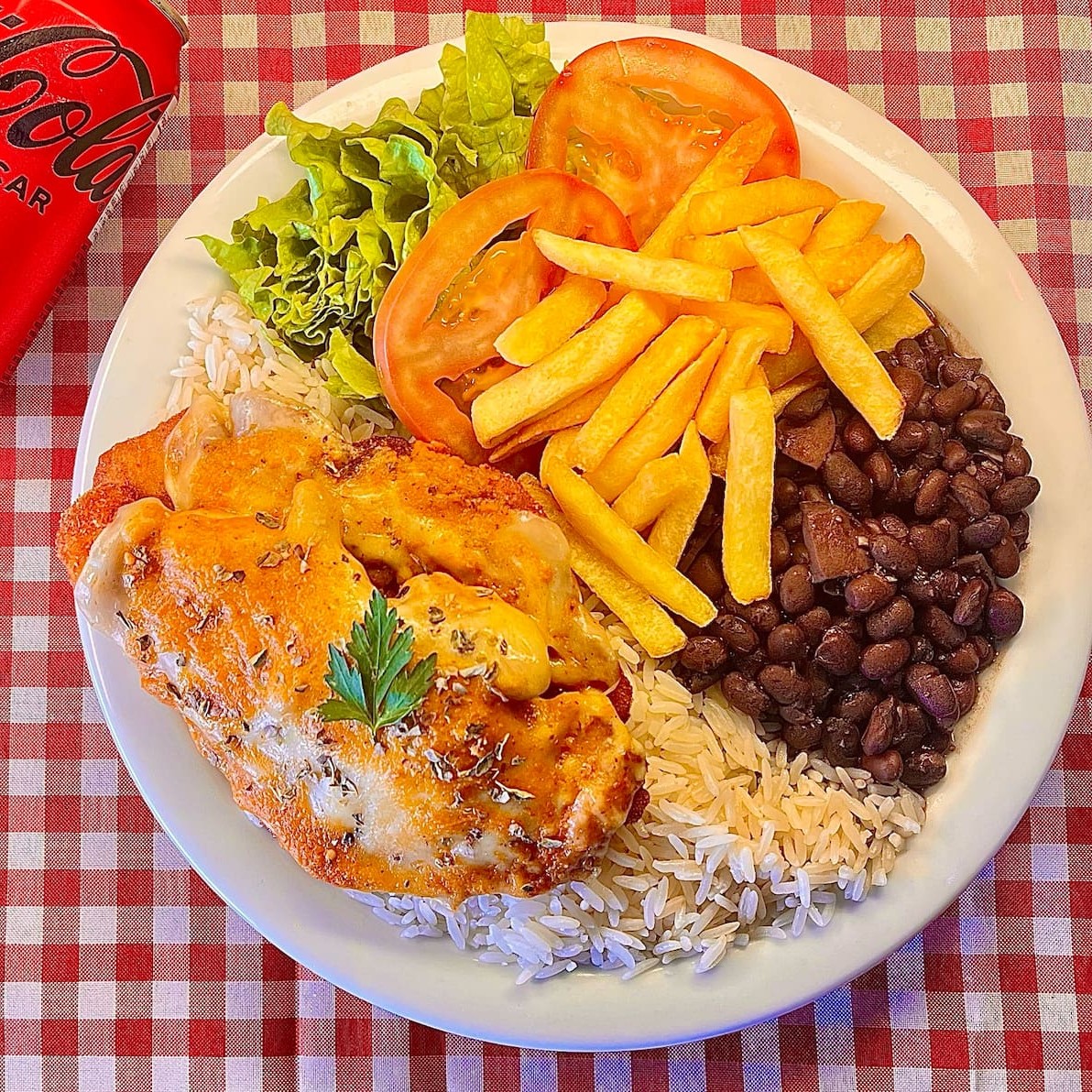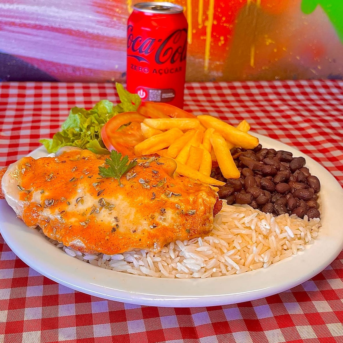 Deliciosa comida caseira: arroz, feijão, farofa, batata frita, bife à parmegiana e salada do Dia. Acompanha coca lata Original 350ml.