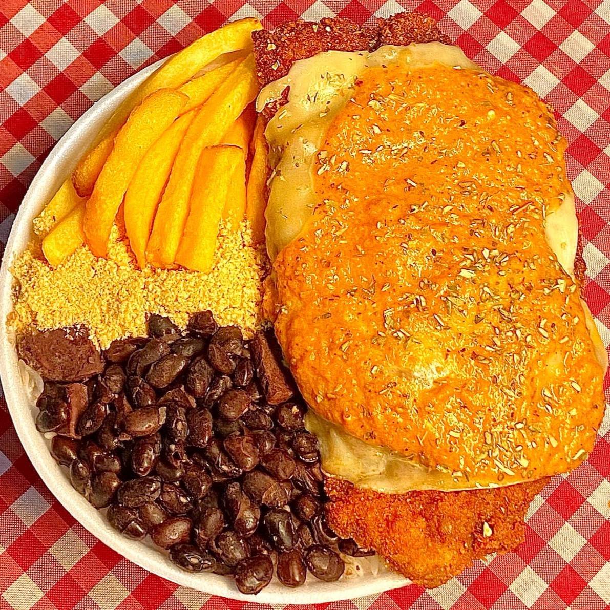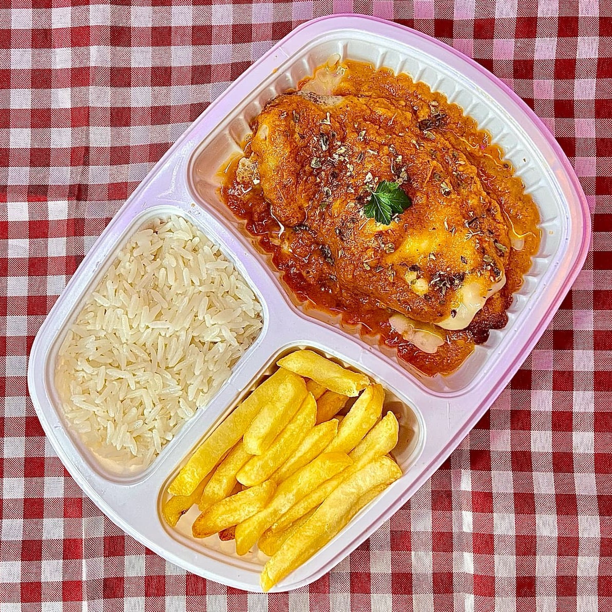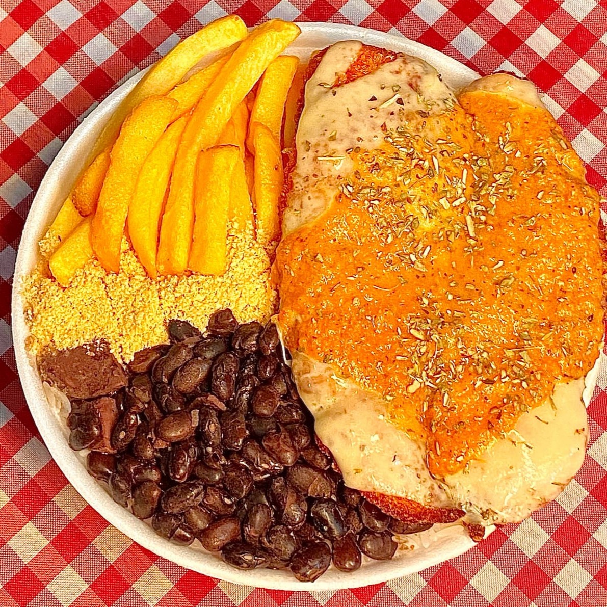 Delicioso Parmegiana de frango, batatas fritas ,arroz soltinho , Feijao e salada Separadinha..