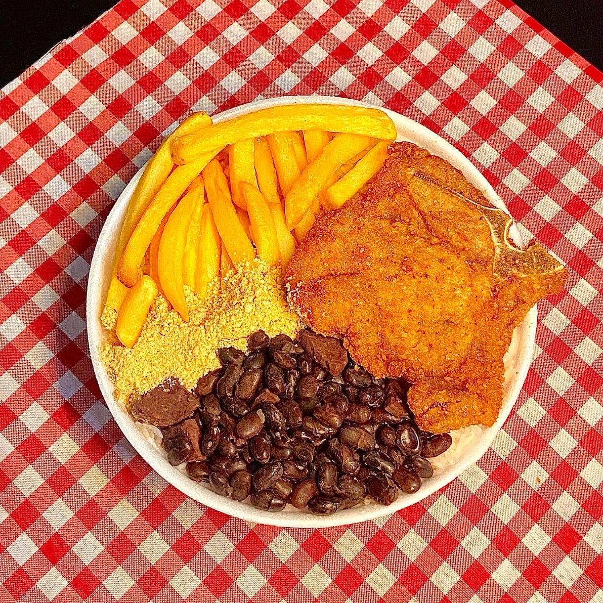 Deliciosa comida caseira: arroz, feijão, farofa, batata frita, bisteca de porco à milanesa e salada do Dia.