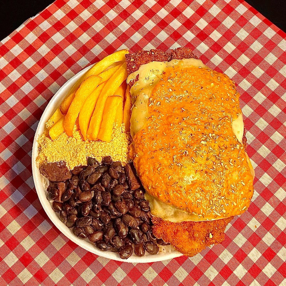 Deliciosa comida caseira: arroz, feijão, farofa, batata frita, frango à parmegiana e salada do Dia.