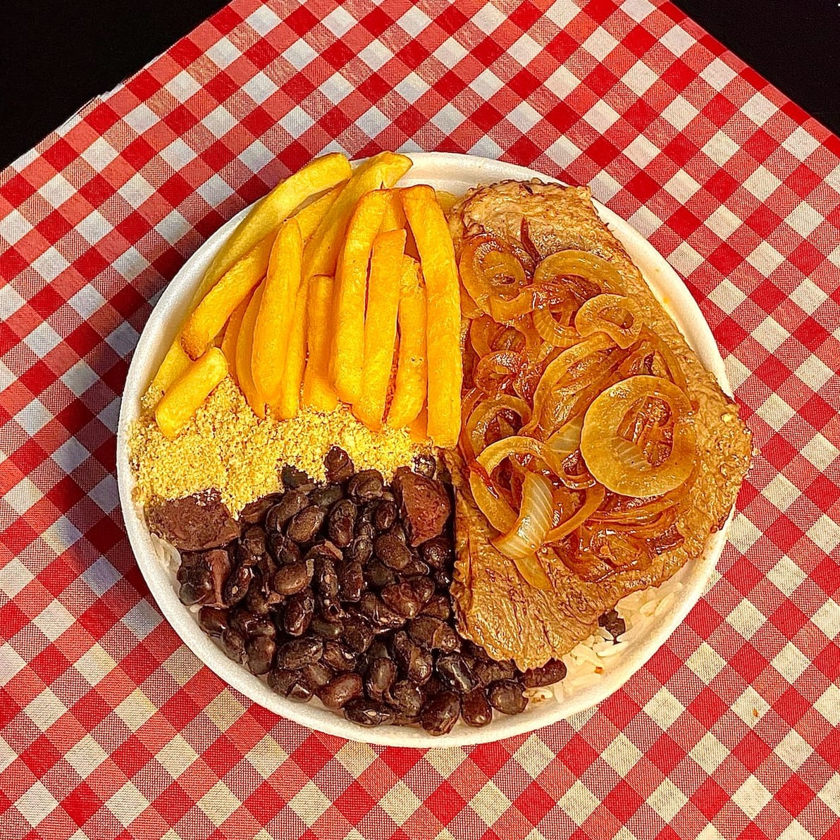 Deliciosa comida caseira: arroz, feijão, batata frita, farofa, bife acebolado e acompanha salada do Dia.