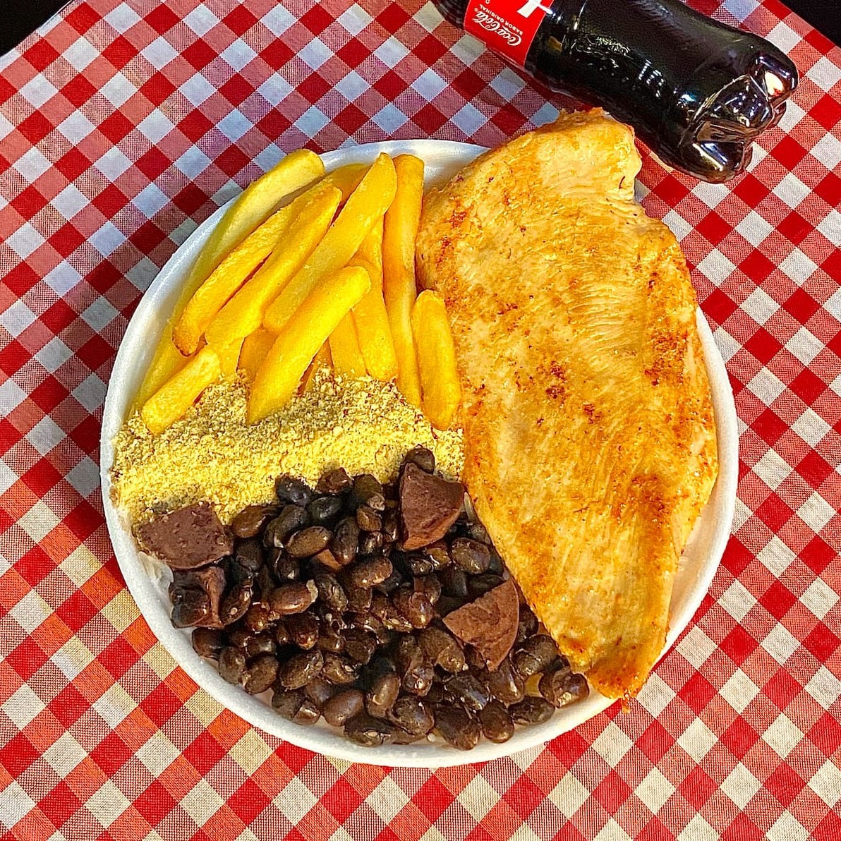 Deliciosa comida caseira: frango grelhado, arroz, feijão, farofa, batata frita e salada do Dia .