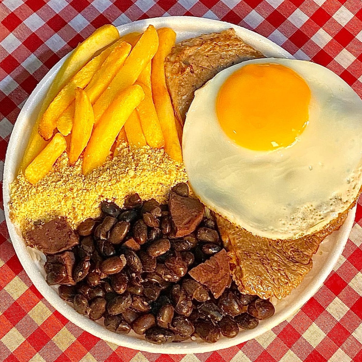 Deliciosa comida caseira: arroz, feijão, batata frita, farofa, bife com ovo e acompanha salada do Dia.