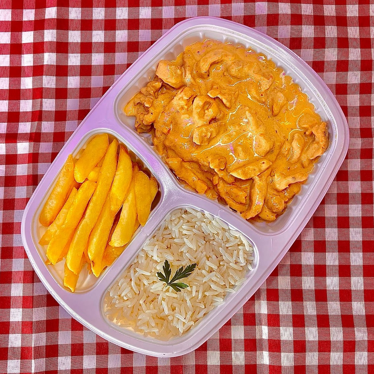 Arroz soltinho (100g), strogonoff de carne cremoso e bem temperado (250g) e batatas fritas douradinhas e crocantes (60g). Uma refeição completa e saborosa, preparada com o toque especial da chef Ana!