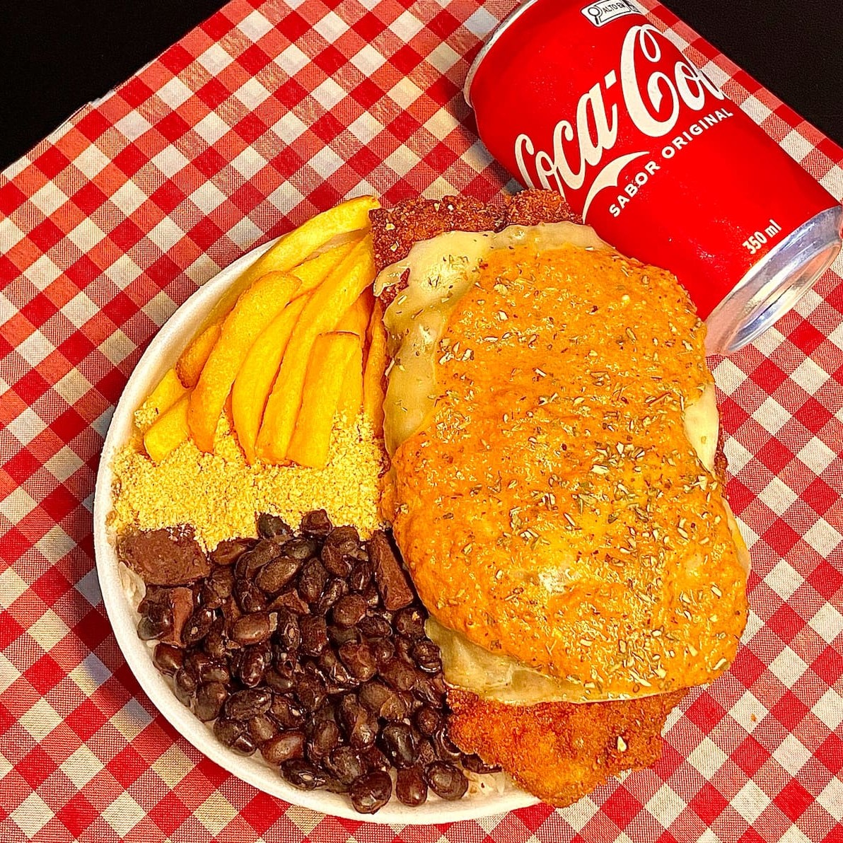 Deliciosa comida caseira: arroz, feijão, farofa, batata frita, frango à parmegiana e salada do Dia. Acompanha Coca-Cola lata Original 350ml. #Tags - Comida caseira - marmita - almoço - marmitex - bife - strogonoff - frango grelhado - milanesa - Parmegiana