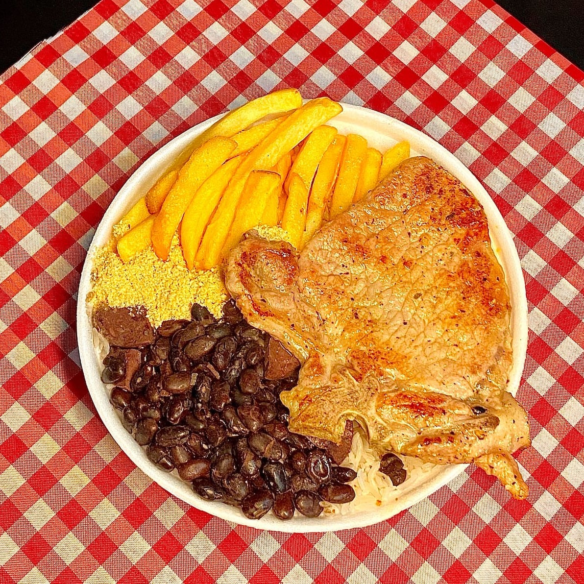 Comida caseira bem temperadinha, acompanha: Arroz soltinho, feijão, farofa, batata frita, bisteca de porco na chapa e salada do Dia.